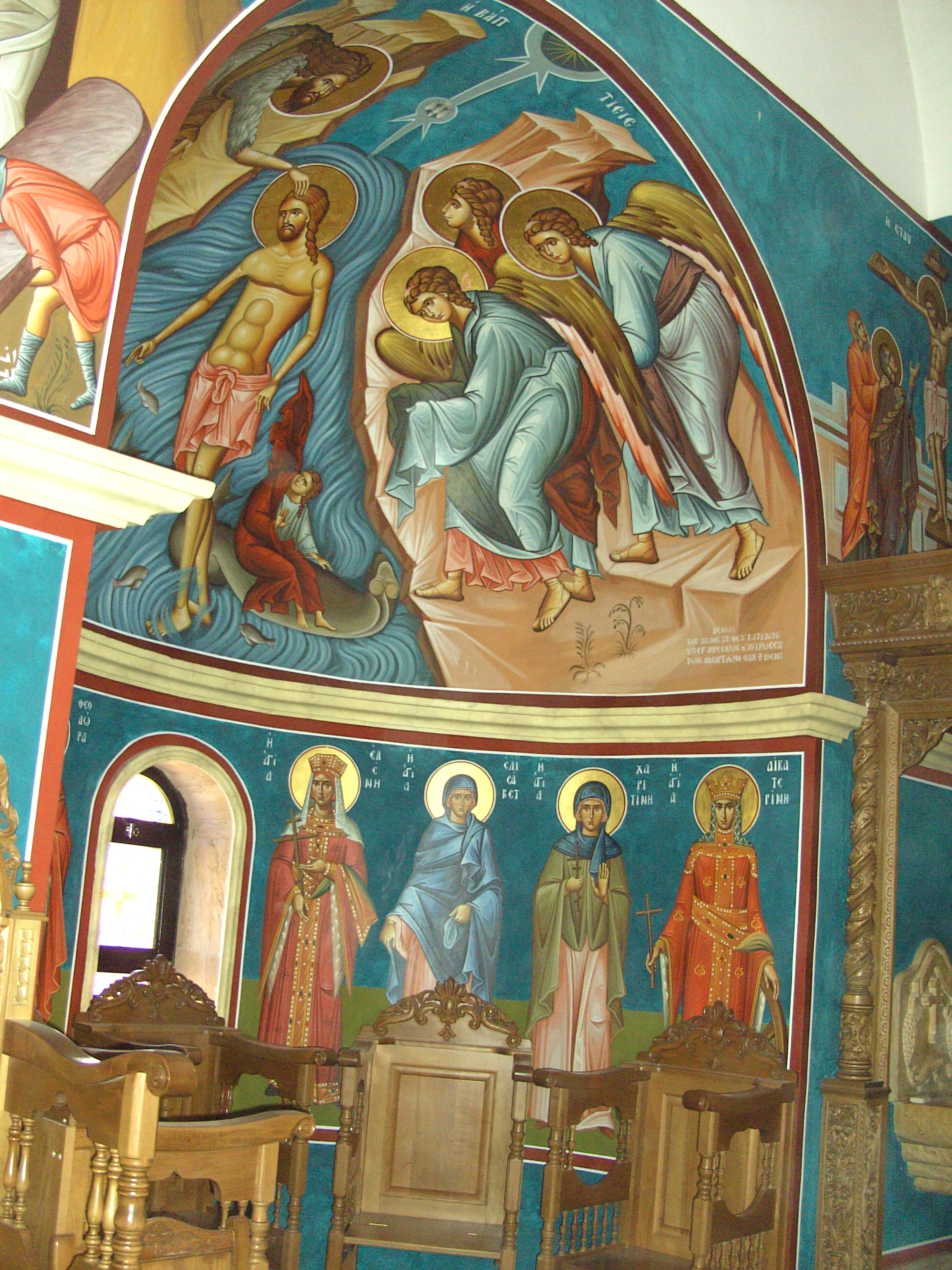 The location along the Jordan River where John the Baptist baptized Jesus has been a focal point for the construction of numerous churches across centuries. Among these, the most recent addition in 2003 is the St. John the Baptist Church, a Greek Orthodox Church. Additional benefactors have contributed enhancements like the intricate interior mosaic floors and the gilding of the dome. Despite its modest size in sandstone, the church boasts harmonious proportions. Inside, vibrant Byzantine-Greek frescoes adorn the walls, while the floors feature charming mosaic patterns crafted in the ancient Greek and Roman opus style. Adjacent to the church, several ongoing construction sites hint at future Armenian Christian and Catholic churches, further enriching the sacred landscape