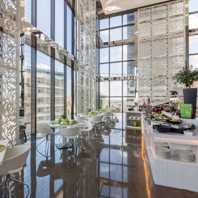 Experience the international cuisine in a lively and stylish setting with a 360-city view over Amman. This all-day dining restaurant serves a rich international buffet for breakfast and lunch.